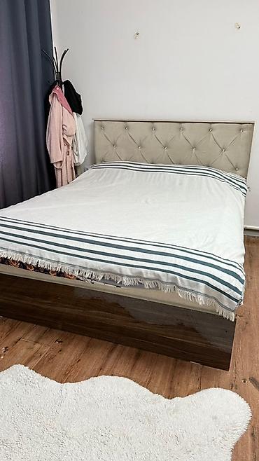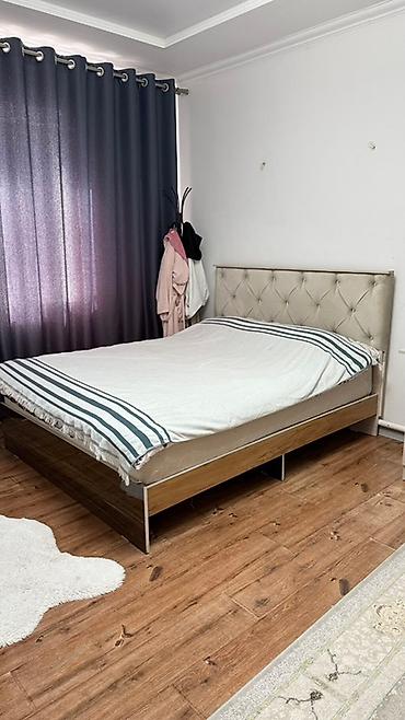 - Кровать двуспальная с мягким высоким изголовьем, обивка светлая с каретной стяжкой. Основание под матрас на коробе из ЛДСП в древесном оттенке; по бокам видны ниши/пространство под хранение. Стильная комбинация светлого изголовья и темного основания, устойчивые боковины.