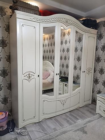 - Шкаф распашной 5‑дверный с центральными зеркалами. Фасады с фигурной фрезеровкой, нижние выдвижные ящики. Внутри — секции для вешалок и полки (комбинированное хранение).