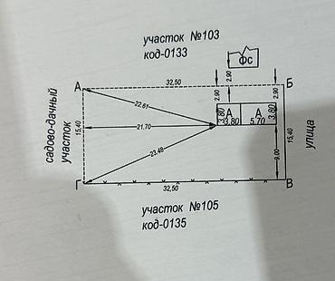 - Схема границ прилагается (размеры по периметру: стороны по 32,50 м и 15,40 м; выезд на улицу 9,00 м). На схеме отмечены места под строения.