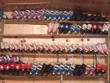 В наличии множество пар на стеллажах — можно подобрать по размеру, жесткости и цвету под мальчиков и девочек.