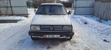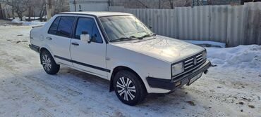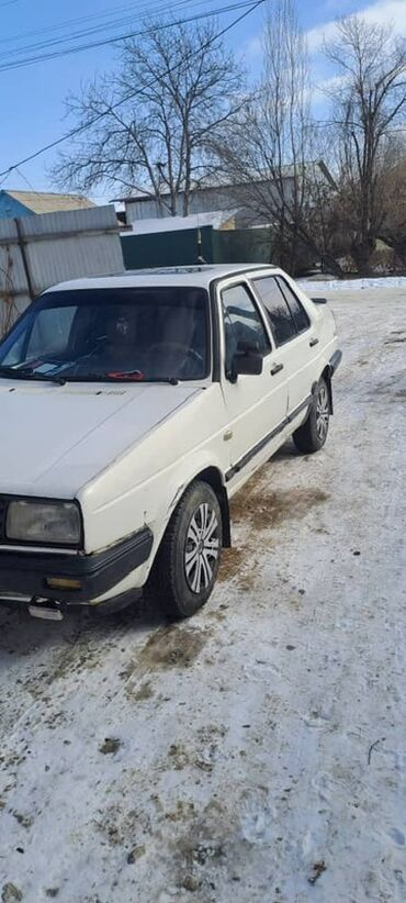 Volkswagen Jetta (Mk2), седан, белый цвет. Пятидверный кузов, оригинальные шильдики Jetta и 3D на крышке багажника, спойлер на кромке багажника, тонированные задние стекла. Легкосплавные диски, зимняя резина. Черные пластиковые бамперы и защитные молдинги по периметру.