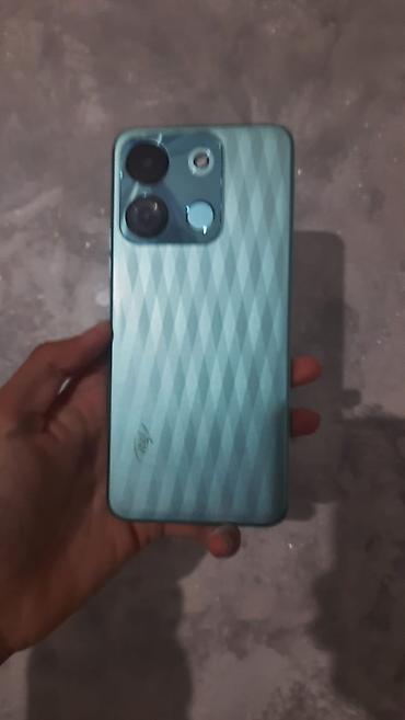 Смартфон в бирюзовом цвете с фактурной задней крышкой «ромбы». Экран с