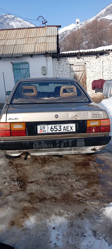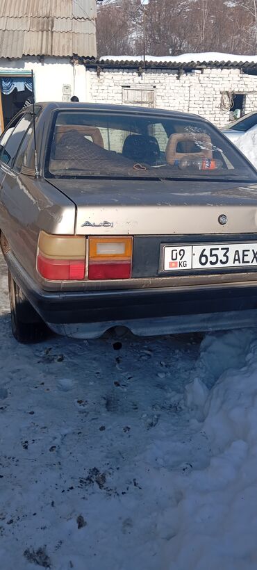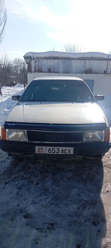 Audi 100 C3, седан, белый цвет. Передняя оптика прямоугольная, решётка с эмблемой Audi, черный передний бампер. На капоте установлен ветровик/дефлектор с надписью Audi. Лобовое с тонировкой верхней полосы. Киргизские номера: 09 KG 653 AEX.