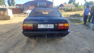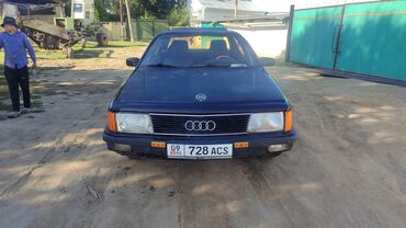 Audi 100 C3 (седан) - Кузов: серебристый седан, 4 двери - Регион: номера KG (Kyrgyzstan), номерной знак на фото - Фары: прямоугольная оптика спереди, оранжевые указатели поворота - Колеса: литые д...