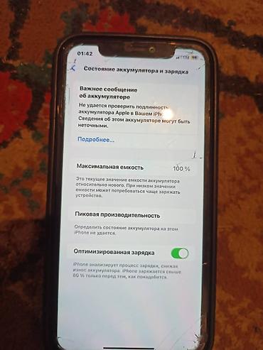 - Аккумулятор: в разделе «Состояние аккумулятора» показана максимальная ёмкость 100%, включена «Оптимизированная зарядка». Система сообщает, что подлинность аккумулятора не может быть проверена, в «Деталях и обслуживании» — «Аккумулятор: неизвестно»