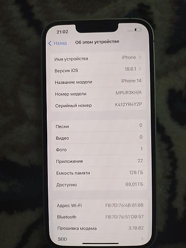 IPhone 14, 128 ГБ, цвет белый (Midnight/White). На фото — реальное устройство. Характеристики и особенности: - Память: 128 ГБ (доступно ~112 ГБ на момент снимка экрана). - iOS 18.6.2 установлена. ...