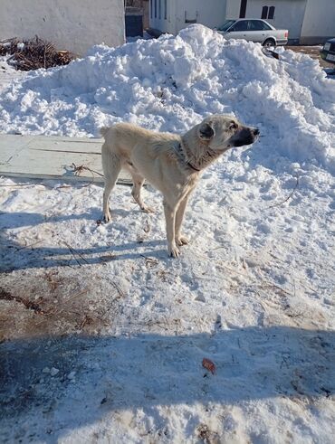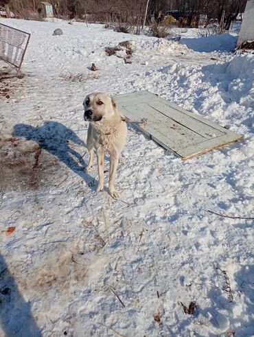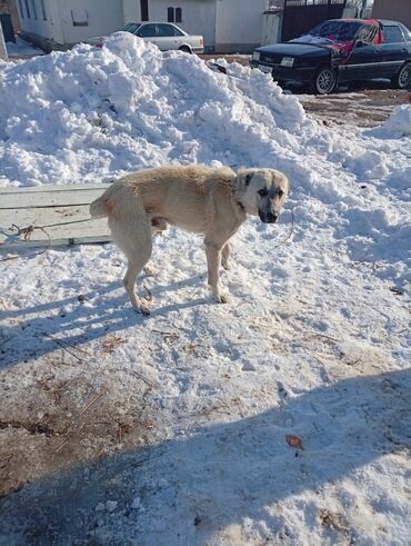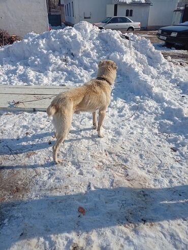 Собака крупной породы, светло‑палевая (кремовая) окраска с темной маской на морде и темными ушами. Пол: не указан. Телосложение мощное, высокий рост, длинные лапы, густая шерсть средней длины, пушистый хвост. На шее – ошейник.