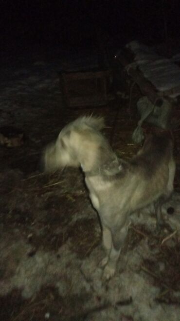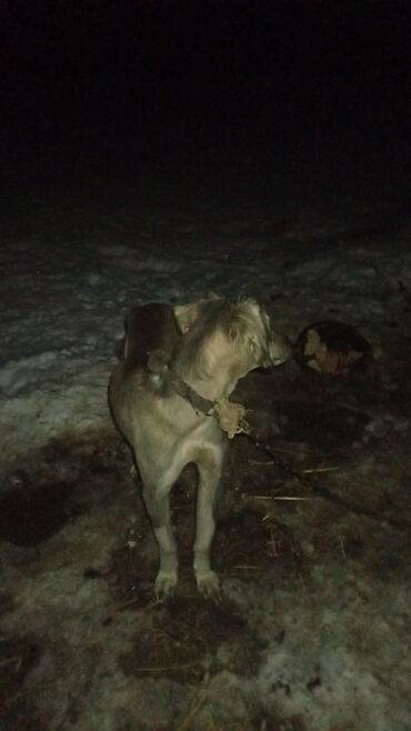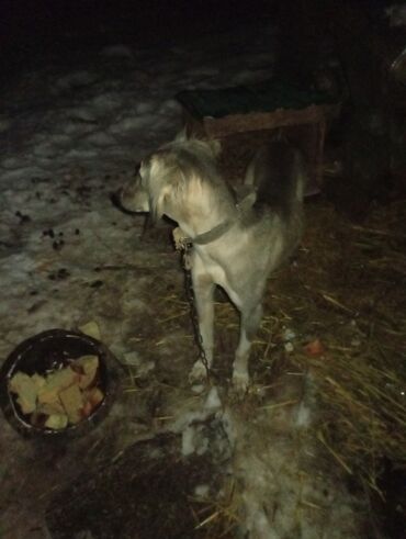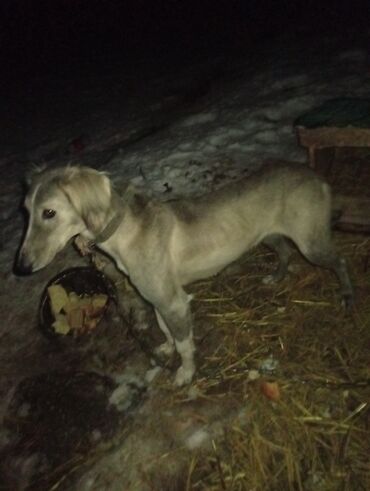 Собака, предположительно из группы борзых (стройное телосложение, узкая морда, длинные ноги, висячие уши с удлинённой шерстью). Окрас светло-серый/песочный с более светлой грудью и лапами. На шее ошейник, содержится на цепи у будки. Видна миска для кормления.