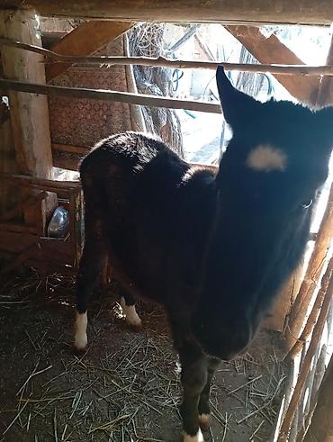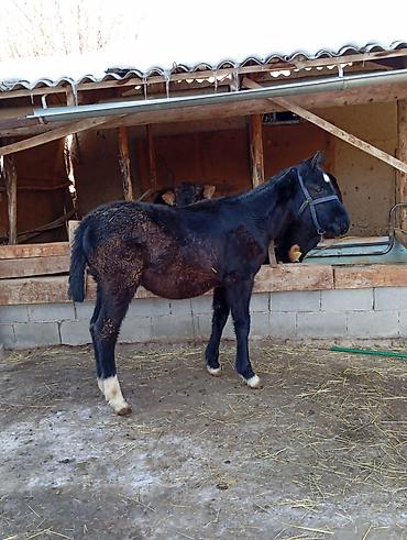 Молодой жеребёнок темной масти. - Возраст: примерно до года (судя по габаритам и типу шерсти). - Масть: вороная/темно-гнедая. - Пол: визуально похож на жеребца. - Тип: сельскохозяйственная/верхово...