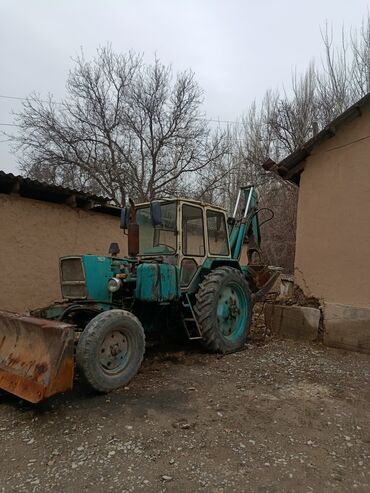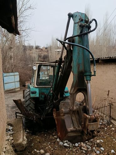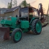 Трактор-экскаватор на базе МТЗ (кабина с остеклением, лестница-подножка, широкие задние колеса). Цвет: бирюзовый с белой кабиной.
