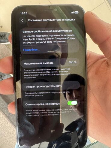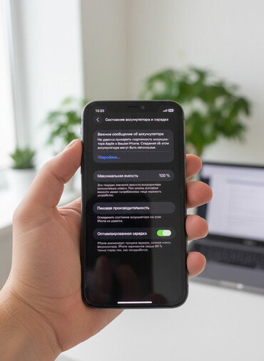 - Аккумулятор: в разделе «Состояние аккумулятора» отображается «Максимальная емкость 100%». На экране есть системное сообщение «Не удается проверить подлинность аккумулятора Apple в вашем iPhone; сведения могут быть неточными». Включена «Оптимизированная зарядка»