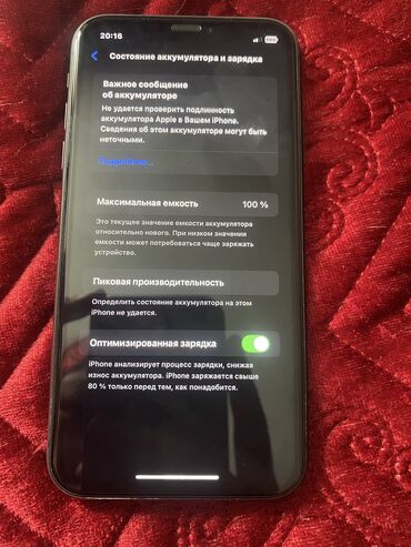 - На экране “Состояние аккумулятора” показано сообщение: “Не удается проверить подлинность аккумулятора Apple в вашем iPhone. Сведения могут быть неточными”. Пиковую производительность определить не удается. Включена оптимизированная зарядка.