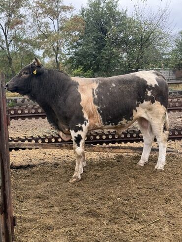 - Возраст визуально — взрослый бык; на ухе бирка идентификации.