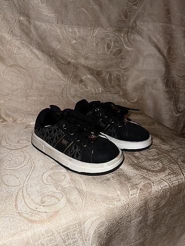 2) Пара 2: низкие кеды чёрные с белой подошвой. Боковые панели с монограммным узором, золотистые элементы и логотип «MK», шнуровка классическая.