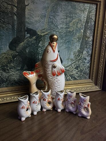 - Состав каждого набора: крупный графин‑рыба с боковой ручкой‑хвостом и 6 мини‑стаканчиков/рюмок‑рыбок в том же стиле.