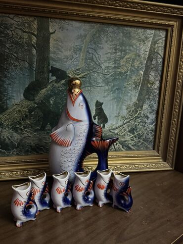 Фарфоровые наборы «Рыбки» (Гжель/ЛФЗ-стилистика): графины и стопки