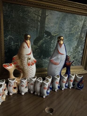 - Два сервиза в виде рыб: один с сине‑кобальтовой росписью, второй с красно‑оранжевой. На графинах золотистые пробки-шарики, позолоченные элементы декора по контуру.