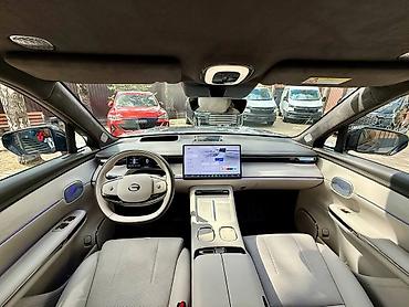 - Просторный салон с панорамным остеклением и премиальной отделкой в светлых тонах.