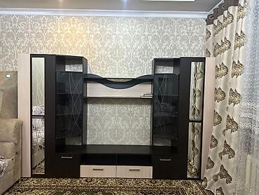 - Две боковые секции-витрины с тонированными стеклянными дверцами и рисунком; внутри — полки для посуды, книг, декора.