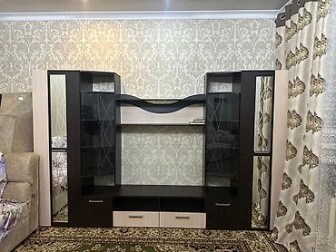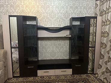 - Современный модуль с нишей под телевизор по центру и декоративной волнообразной полкой сверху.