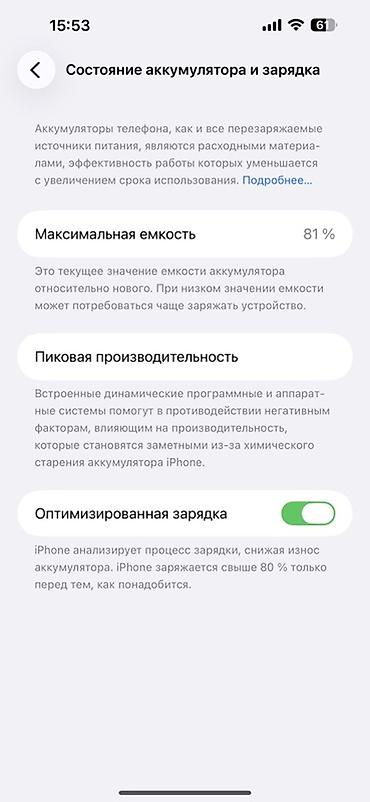 - Аккумулятор: максимальная емкость 81% (скриншот «Состояние аккумулятора и зарядка»), включена «Оптимизированная зарядка».