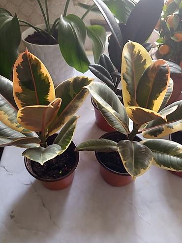 - Фикус эластика вариегатный (Ficus elastica Tineke/Variegata): крупные кожистые листья с кремово-жёлтой и тёмно‑зелёной пестролистностью, розоватые жилки. Формирует аккуратный куст, хорошо очищает воздух. Любит яркий свет без прямых полуденных лучей.