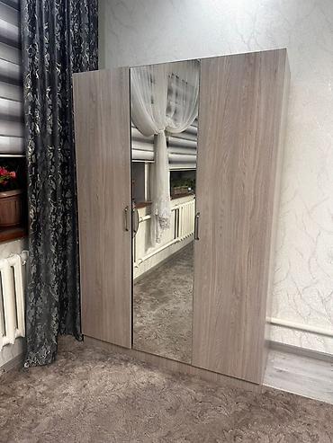- Трехдверный шкаф с зеркальной центральной створкой. Внутри — секции для вешалок и полок (типовая компоновка для повседневной одежды). Удобные продолговатые ручки.