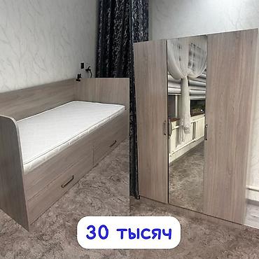 Комплект мебели для спальни/детской в цвете дуб сонома (или близкий серо-бежевый древесный оттенок).