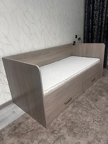 - Кровать-диван с высокой спинкой и боковиной. Внизу — три выдвижных ящика на направляющих, удобных для хранения белья и вещей. Матрас односпальный на фото входит в состав комплекта.