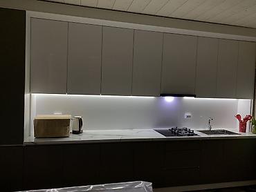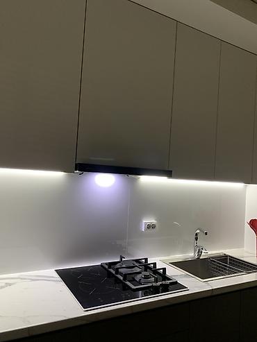 - Размеры: на фото 4,5м на 2,80м. Фартук во всю длину гарнитура, ширина стандартная для рабочей зоны (60 см).