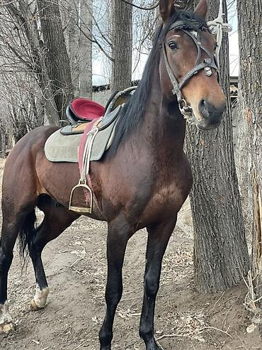 Срочно срочно жашы 3 жаш эркек малга улака универсал басыгы бар женил оозу жумшак Кеми бар ат ысык атада Лошадь под верховую езду - Масть: гнедая, с белой отметиной на морде и белой «чулочной» отм...