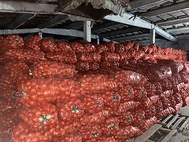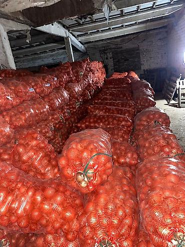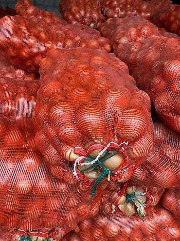 Репчатый лук в сетчатых мешках - Калибр: средний/крупный, выровненные округлые луковицы золотисто‑коричневого цвета. - Упаковка: прочные красные сетки с ручками-завязками; мешки уложены на поддоны...
