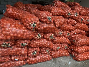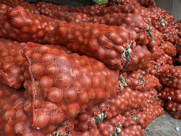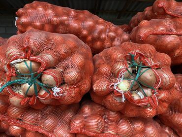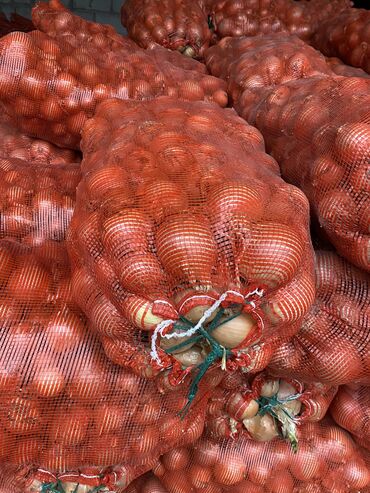 Репчатый лук в сетчатых мешках - Калибр: средний/крупный, выровненные округлые луковицы золотисто‑коричневого цвета. - Упаковка: прочные красные сетки с ручками-завязками; мешки уложены на поддоны...
