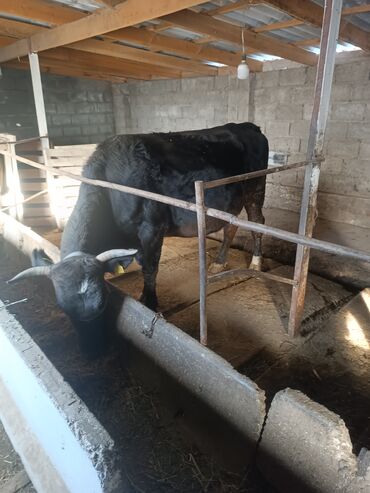 Бык чёрного окраса, рогатый, на привязи, содержится в отдельном стойле. Крупный, широкая спина и грудь, крепкий костяк, ровные конечности. Кожа и шерсть тёмные, плотные. Уши с бирками. Спокойный ха...