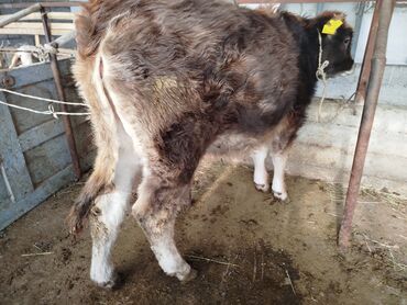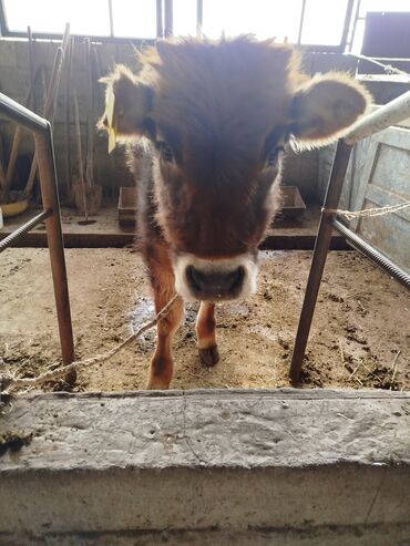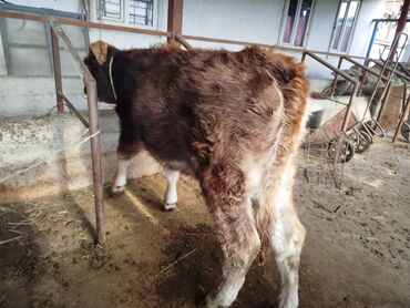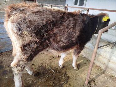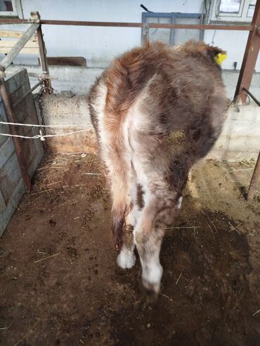 - Порода/тип: помесный мясной телёнок (окраска буро-рыжая с белыми отметинами на ногах и брюхе).
