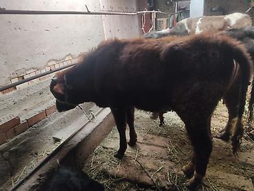 Бычок молодняк, рогатый. Окрас рыже‑бурый, густая зимняя шерсть. Содержание в стойле, на привязи. На фото — телёнок средних размеров, крепкая конституция, прямые конечности, развитая грудь и спина....