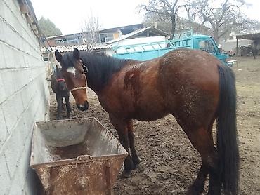 Лошадь (масть гнедая) с широкой белой отметиной на лбу. Плотного телосложения, крепкие ноги и копыта, длинная густая грива и хвост. На фото — в недоуздке, привязная, стоит спокойно у кормушки. Подходит для хозяйственных работ в упряжи или под седло, а также для прогулочного верхового использования. Спокойный темперамент по внешним признакам: не пуглива, терпеливо стоит при осмотре и кормлении. Удобный формат корпуса для выезда в полях и в сельском хозяйстве, уверенный шаг. Возможна работа в паре с другой лошадью (на фоне виден жеребёнок/молодняк).