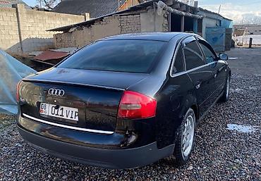 Audi A6 седан, черный цвет кузова. Кузов C5 дорестайлинг/рестайлинг переходный с характерной решеткой и прямоугольной оптикой. Номерные знаки KG на белом фоне.