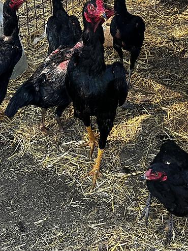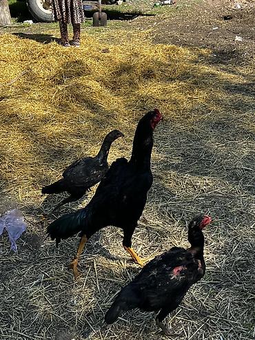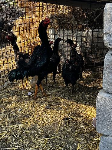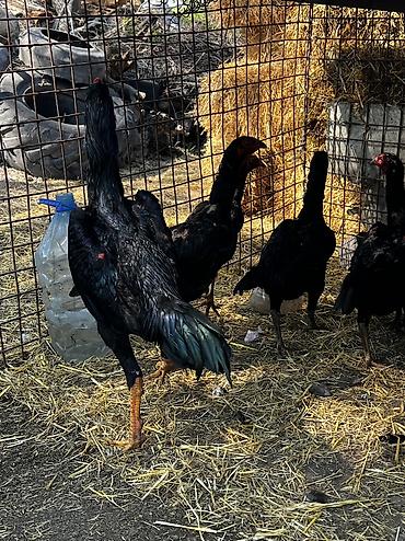 Петухи и куры бойцовой породы (тип аси́ль/шамо), черное оперение.
