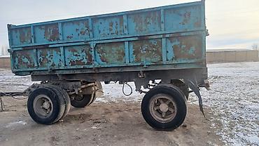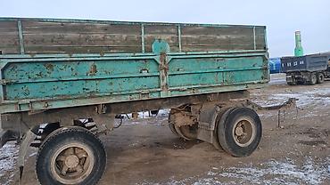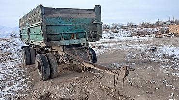 Габариты кузова по фото — ориентировочно средний/крупный объем; высота увеличена деревянными надставными бортами. Прицеп готов для агрегирования с техникой, имеющей соответствующую сцепку и вывод тормозов/гидравлики (для подъема платформы).
