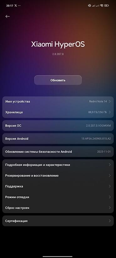 - Память и ПО: хранилище 256 ГБ (доступно ~88,9 ГБ занято), Android 15, фирменная система Xiaomi HyperOS версии 2.0.207.0 VOGMIXM, актуальное обновление безопасности Android до 01.11.2025.