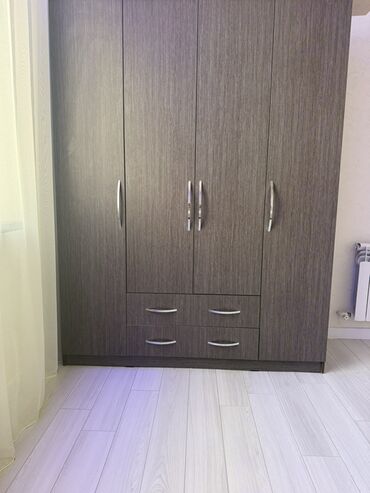 - Шкаф распашной 4‑дверный с двумя нижними выдвижными ящиками. Внутри — секции для вешалок и полки (распашная конфигурация позволяет использовать пространство по всей высоте).