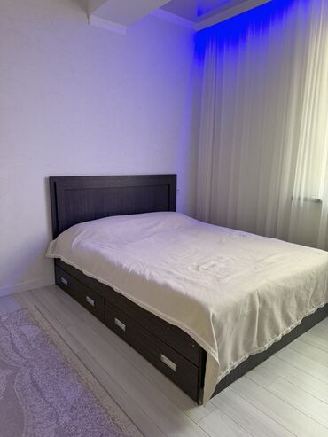 - Кровать двуспальная с высоким прямоугольным изголовьем и встроенными выдвижными ящиками по боку (4 секции) — удобное место для хранения постельных принадлежностей.