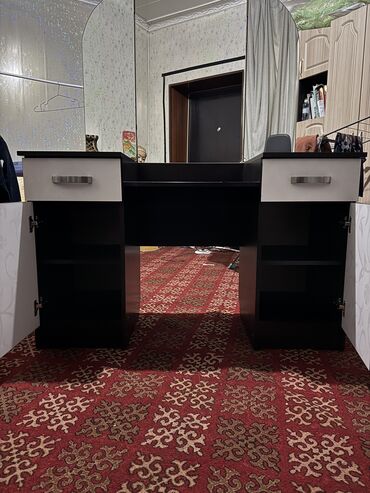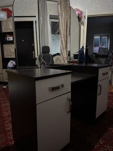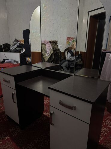 - Конструкция: столик на двух тумбах, между ними — рабочая столешница. Сверху установлено большое трёхстворчатое зеркало: центральная прямоугольная секция и две боковые арочные.