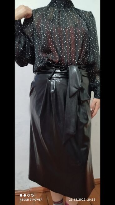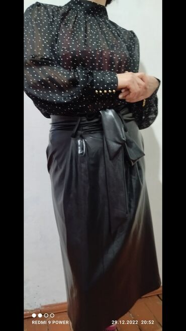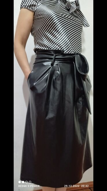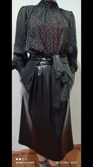 Юбка из эко-кожи с ремнём - Цвет: чёрный, матовый блеск - Длина: макси - Материал: плотная эко-кожа, держит форму и красиво драпируется Стильная базовая вещь: сочетается с свитерами, кожаными ку...
