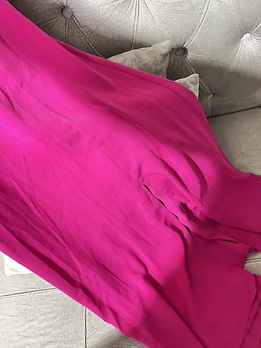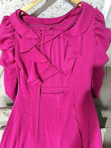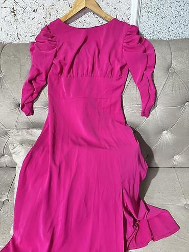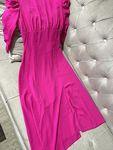 Яркое женское платье миди насыщенного фуксийного цвета.