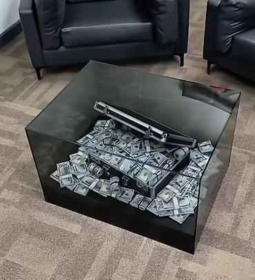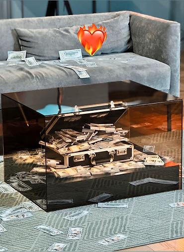 - Эффектный дизайнерский столик в виде прозрачного «сейфа» из тонированного акрила/стекла с инсталляцией: внутри — чемодан и стопки «купюр» (декор).