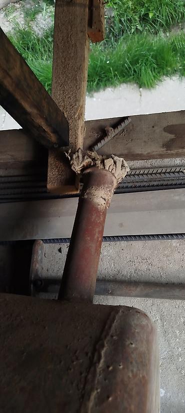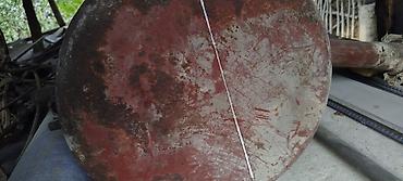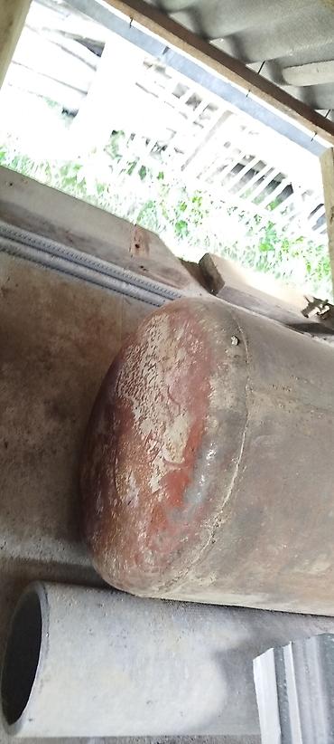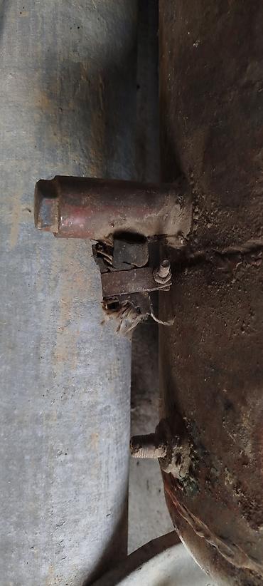 Старый металлический ресивер/бак (вероятно от компрессора или гидроаккумулятора). Описание: - Материал: сталь. - Форма: цилиндрическая, с плоскими торцами. - Патрубки: 2 штуцера сверху. - Верхнее ...