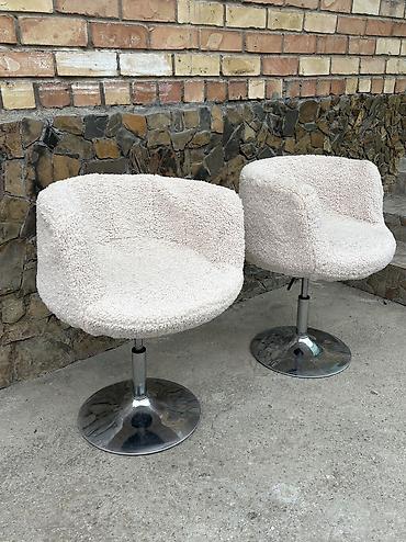 - 2 вращающихся кресла на круглых дисковых опорах. Низкая посадка, полукруглая спинка, круглая сидушка. Опора из полированного металла с центральной стойкой.