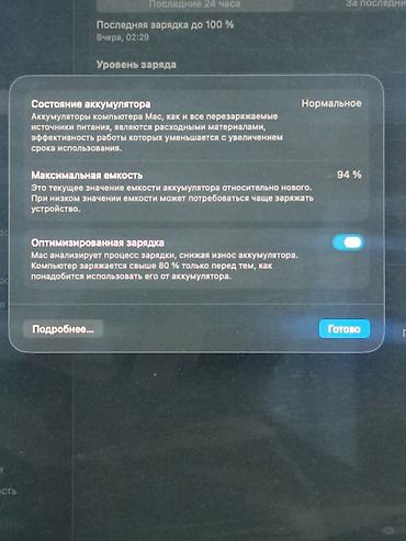 - Аккумулятор: состояние нормальное, максимальная ёмкость 94% (по системному отчёту). Включена «Оптимизированная зарядка».
